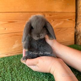 Meravigliosi cuccioli di coniglio di razza Ariete Nano di colorazione Blu, selezionati, iscritti al libro genealogico, genitori e fratelli visibili.