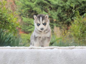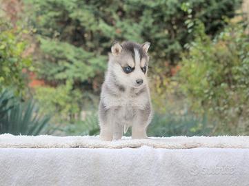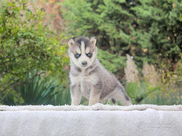 Lui è Zenith (nome indicativo), magnifico cucciolo di Siberian Husky in cerca di una nuova casa. Maschietto di 2 mesi di età, è bellissimo, giocherellone e molto affettuoso. I suoi maestosi occhi azzurri sapranno incantarvi al primo sguardo. Nato nel nostro allevamento, sarà un prezioso compagno di vita.