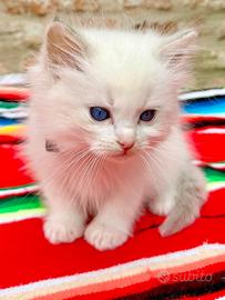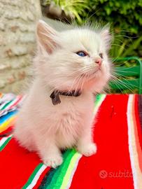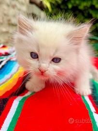 Meraviglioso cucciolo di ragdoll nate il 10 febbraio 2026. Ha un carattere dolcissimo e affettuosissimo tipico della razza. Mangia già cibo secco per cuccioli e ha già imparato a usare la lettiera e il tiragraffi. Viene consegnate con prima dose vaccino, trivalente, con trattamento antiparassitario eseguito e libretto sanitario. I genitori sono entrambi ragdoll puri con pedigree, visibile a richiesta, con linee di sangue esenti dalle patologie della razza ( HCM e PKD N/N). Già pronto per la consegna che curiamo di persona a Forlì ( non facciamo staffette o con corrieri). Prezzo 450