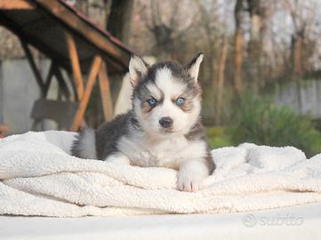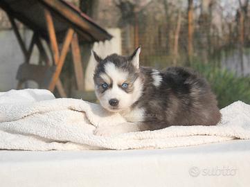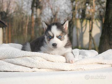 Disponibile questo piccolo maschietto di Siberian Husky nato nel nostro allevamento. Ha 2 mesi di età e si chiama indicativamente Royce. Un musetto di cui vi innamorerete a prima vista. E' sempre con la coda scodinzolante. Ha personalità da vendere e vi renderà felici con la sua frenetica voglia di giocare.
