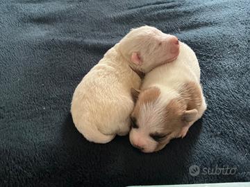 Disponibile ultimo cucciolo Maschio di Jack Russel. Svezzato di due mesi e pronto per una nuova casa. Il cucciolo è tutto bianco con una macchiolina marrone chiaro dietro l'orecchio