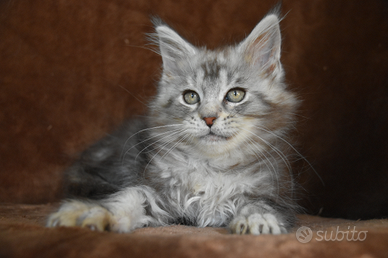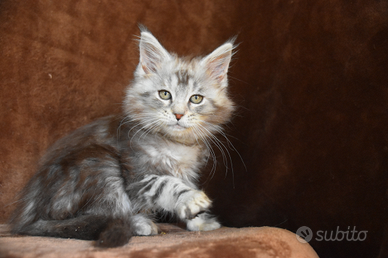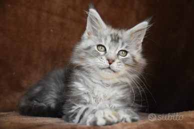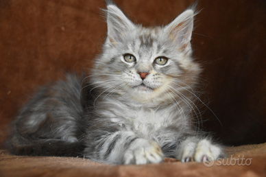 Abbiamo disponibile nel nostro allevamento dolce blu strepitosa gattina di Maine coon nella sua colorazione argentata black silver tabby, carattere dolcissimo super coccolona! viene cedutabda compagnia con pedigree riconosciuto afsi passaggio di proprietà doppia sverminazione doppia vaccinazione kit cucciolo test genetici dei genitori contratto di cessione e la nostra assistenza data 14anni di esperienza
