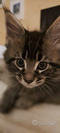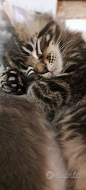 Splendido cucciolo di Maine coon nato il 14/11/2025 con manto brown tabbie. Verrà ceduto a partire da inizio Febbraio sverminato e con ciclo vaccinale completo. No pedigree. Genitori tastati Filv/Felv. Per maggiori informazioni contattare via whatsapp.