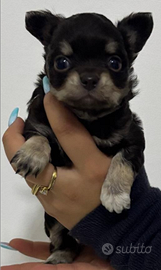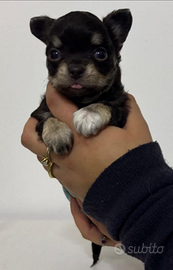Cedesi ultimo cucciolo maschio chihuahua, pelo lungo, choco tan tricolor, figlio di genitori con pedigree, papà lilac 3kg mamma champagne (crema) 2,5kg.