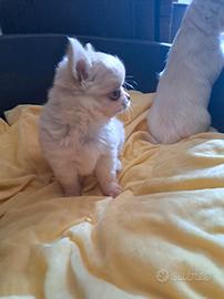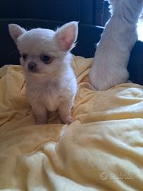 Disponibile stupendo cucciolo di chihuahua bianco pelo lungo nato e cresciuto in casa il 25 gennaio.il cucciolo corretto in tutto e di taglia puccola,ha genirori sanissimi esenti da patologie.lo cedo vaccinato con pedigree enci .