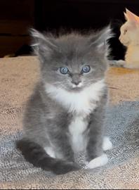 Il cucciolo ha gli splendidi occhi blu tipici dei Ragdoll e la lunga coda caratteristica dei Maine Coon. Ma soprattutto ha un carattere eccezionale, è particolarmente buono, pacato e affettuoso.