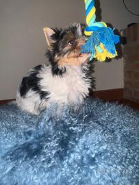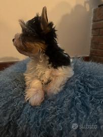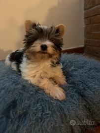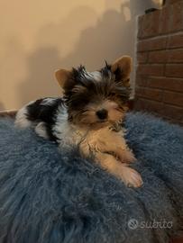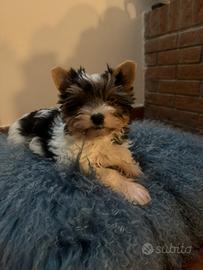 Cucciolo maschio di Yorkshire Biewer di 3 mesi, taglia molto piccola (genitori visibili) cerca una famiglia amorevole. Il cucciolo è già svezzato e abituato ad usare la traversina.