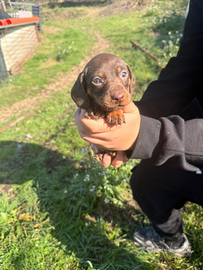 Disponibili da subito meravigliosi cucciolli di bassotto color ciocvollato.I cucciolli sono nati in ambiente famigliare e curati con attenzione.I cucciolli anno compiutto 60 giorni sono vaccinati e sverminati e godono di ottima salute.Genitori visibili sull posto taglia piccola .I cucciolli si rilasciano con libretto sanitario che include primo vaccino e 2 sverminazioni.Per info 3759050580 prezzo 650