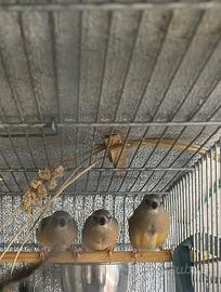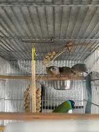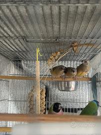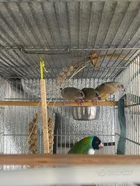 Cedo novelli di diamanti di gould un maschi e una femmina nati a ottobre 2025 , nati in purezza abituati a vivere in voliera in balcone . Godono di ottima salute . Come si può vedere dalla foto stanno ancora finendo la muta i genitori sono petto viola testa nera lei il padre testa nera petto bianco . Non cedo solo la novellina femmina. Roma zona. Castelverde. 40 euro a soggetto .