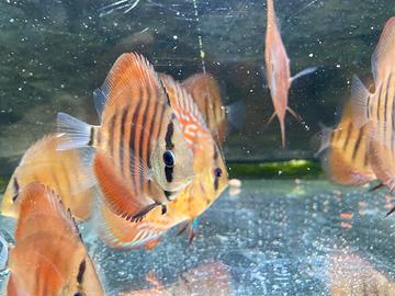 Causa dismissione acquario, vendo 11 Discus di sei mesi e mezzo , nel ultima foto si vedono i genitori , abituati in acqua di rubinetto, mangiano anche granulato, in ottime condizioni di salute, prezzo trattabile, disponibile anche l'acquario in cui si trovano e un juwel rio 125, con filtro esterno tetra ex 800