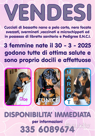 Sono ancora disponibili 3 femmine. Colore nero focato, come si vede dalle foto allegate. Sono nate il 30 marzo 2025 per cui hanno 10 mesi . Sono gia' state sverminate, vaccinate e microchippate e possiedono libretto sanitario oltre al regolare pedigree. Anche i loro genitori hanno il pedigree ed anche il DNA depositato. Sono tutte molto docili e affettuose. Se siete realmente interessati, e volete avere ulteriori informazioni, potrete contattarmi al numero che compare sulla locandina allegata.