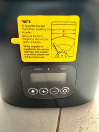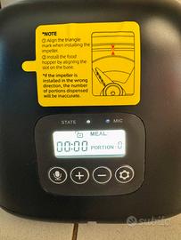 Vendo dispenser cibo x gatti e cani taglia piccola. Alimentazione tramite cavo usb (incluso) e presa (non inclusa ma va bene quella del cellulare). Colore nero, programmabile fino a 4 pasti con 3 quantità diverse. Capienza 3 litri equivalente a 1 kilo di croccantini. Possibilità di alimentarlo con 3 batterie type D. Alloggiamento sali di silicio sul coperchio per mantenere i croccantini asciutti. Possibilità di registrare un messaggio vocale che verrà riprodotto all'erogazione del cibo. Display retroilluminato e semplice da usare. Manuale in italiano e ciotola in acciaio lavabile in lavastoviglie.