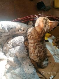 Cucciola razza Bengala nata in data 29.12.2025.socievole e dolcissima occhi blu colore del manto particolarissimo:manto marroncino tendente al rame; pedegree Afsi anche for breading, microchip, doppia sverminazione, doppia vaccinazione.Nutrita con cibo di eccellente qualità, sanissima Genitori entrambi di mia proprietà e visibili. Assistenza e consulenza post vendita. kit cucciola compreso . ?1000 legg trattabili Test genetici visibili