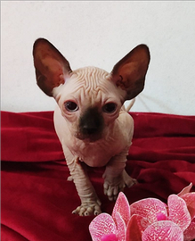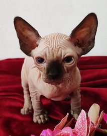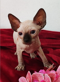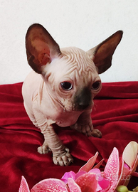Mantiene la genetica degli Elf e il suo meraviglioso carattere , le orecchie rimangono della forma degli Sphynx, il manto è completamente nudo, colore Seal point occhi celesti.