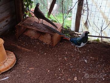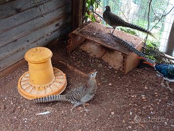 Cedo trio riproduttore di fagiano di Lady, abituato in voliera ampia con spazi ben organizzati e in ottima salute; il prezzo è di 135 € per il trio, non trattabili, e li cedo esclusivamente perché, da semplice appassionato, non posso più dedicare loro il tempo necessario; disponibili anche altre due femmine, cedute a 50 € ciascuna, oppure 45 € se acquistate insieme al trio.
