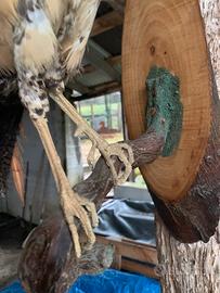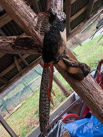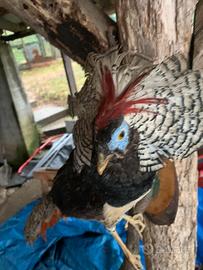 L'uccello impagliato nella foto è un Fagiano di Lady Amherst (Chrysolophus amherstiae), un uccello originario della Cina e del Myanmar. L'esemplare mostrato è un maschio, caratterizzato dal suo piumaggio altamente distintivo e colorato.
