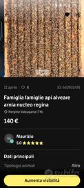 Vendo, per riduzione dell'apiario 5 famiglie di api sane, esenti da malattie, trattate (dopo blocco covata invernale con caduta zero) hanno superato molto bene l'inverno. Trattamenti esclusivamente in BIOLOGICO Regine marcate, carniche o ibridi ottima genetica. Disponibili, se vuoi, in arnie dadant (messe bene). Zona Pergine Valsugana. Contattami per maggiori info. Il prezzo 140/150 euro senza cassa, in base alla "forza", circa 9 telaini, trattabile x acquisti multipli