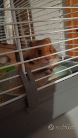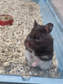 Cedo l'ultima cucciola femmina di criceto Dorato di 2 mesi, in foto ci sono anche i genitori la mamma bianca e nera e il papà marrone tricolore. Per informazioni contattatemi su WhatsApp.