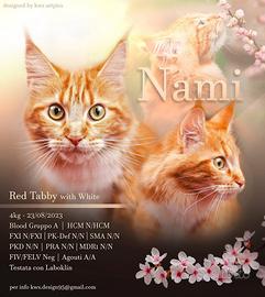 Nami è una femmina rossa di Maine Coon nata il 22 agosto 2023, negativa a tutti i test genetici ma N/HCM e N/FXI, perciò cerchiamo un maschio che sia N/N per cardiomiopatia ipertrofica e fattore XI. Negativa a fiv e felv. Ecocardio visionabile eseguito il 11/04/25 perfettamente sana.