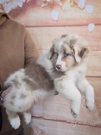 Disponibili alla prenotazione splendida cucciola di pastore australiano femmina red merle coda corta naturale, un occhio azzurro e un occhio ambra-verde.