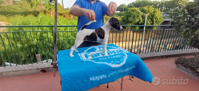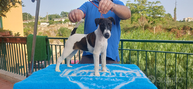 Bellissima cucciola di fox terrier a pelo liscio. Femmina nata il 3 maggio, pedigree enci, ciclo di sverminazioni e vaccini completo. I fox sono cani molto attivi, molto giocherelloni ma anche discreti in casa non essendo abbaiatori. La cucciola è l ultima rimasta della cucciolata , abituata al guinzaglio e socializzata con altri cani.