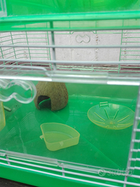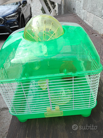 Gabbia per criceti completa di accessori in perfette condizioni: Ruota, tubo, scivolo,beverino,vaschetta,contenitore cibo,casetta noce di cocco. Misure cm 37 per 30 cm. Altezza cm.,35. Come da foto.