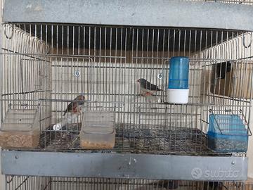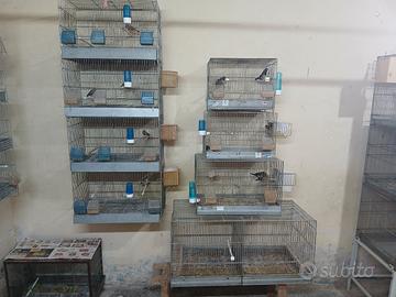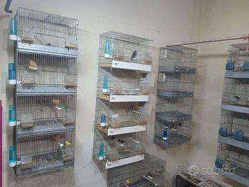 Vendo batteria da 6 borgovit con 3 coppie di inseparabili una coppia di cocorite con tre pulli quasi svezzati 6 gabbie da 55 6 gabbie da 45 8 gabbie da 40 2 gabbie con fondo in plastica 1 gabbione da 90 complete di accessori nidi mangiatoie beverini stecche ecc 5 coppie di diamantini con uova 14 passeri del Giappone 5 canarini 4 maschi e una femmina prezzo 550