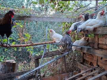 Galli di notevoli dimensioni e galline allevati in libertà.