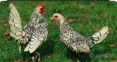 Vendo due coppie di galline Sebright una bianca e nera e una oro. La Sebright è a tutt'oggi riconosciuta come la razza di gallina bantam più affascinante e attraente, per il suo aspetto al tempo stesso elegante e simpatico. Li vendo a 30€ a coppia