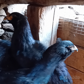 Giovani galline aurecane (le galline dalle uova azzurre)due coppie 70 euro la coppia di colore nero cangianti sul blu-verde