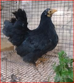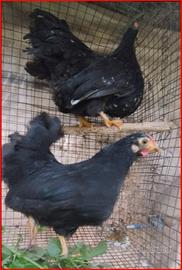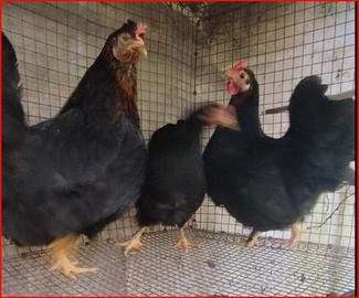 Galline e galli chicchinelle di colore nero allevate con sementi di qualità ed erbe prative in box con terreno vegetale. Le galline sono pronte per la deposizione e alcune già depongono, nate l'anno scorso.