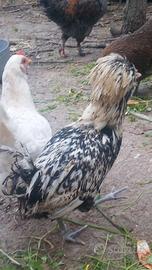 Disponibile gallo padovana ciuffata giovane è pronto alla riproduzione a 15 euro, colorazione argento orlo nero, foto reali del soggetto, accetto scambio con gallina stessa razza con gallina amrock, pulcini o per cambio linea sangue. Per chi fosse interessato o proposte scriva qua.