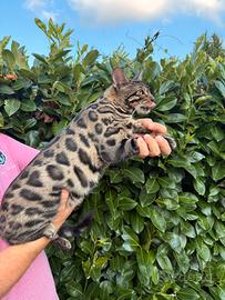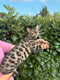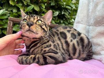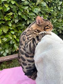 Disponibile gattina Brown spotted tabby di 9 mesi genitori purosangue bengala di altissima genealogia , provvisti dei pedigree e test genetici, controllati per le malattie infettive. Un carattere molto equilibrato,calma, tranquilla , buonissima ed educatissima! È sverminata, vaccinata e sterilizzata ,ottima salute ed è molto robusta, supera con la grandezza anche molti maschi , sterilizzata! Molto bella ed è di una tonalità più rara , wild , porta charcoal, colore naso nero con gli occhi grandi verde-gialli , mantello scuro con il contrasto bello evidente, le macchie molto evidenti e ben staccati . Rimborso spese esiguo. 3923722842
