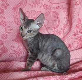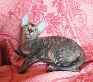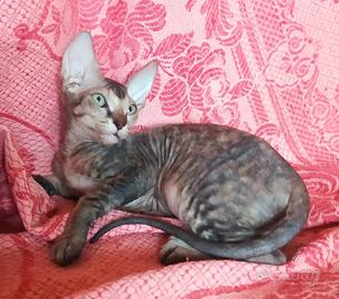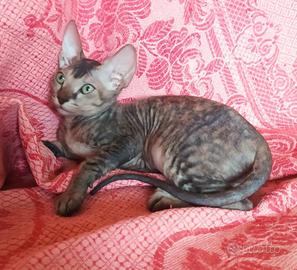 Disponibilità a consegnarla gratuitamente a ostia lido ( Roma) il 21 aprile,ma con possibilità di consegna in altre località ( isole incluse) con contributo, femminuccia di don sphynx nata da cucciolata domestica privata ( no pedigree) il 18 gennaio 2026. La piccola è di colore tortie tabby ( rossa e nera tigrata), tipologia velour ( con morbida e sottile peluria ). È molto dolce ed affettuosa. Abituata ai rumori della vita familiare, alla lettiera,alla convivenza con altri gatti, al cibo secco ,umido e alla carne ben cotta. Viene ceduta con libretto sanitario, sverminazione e due vaccinazioni. Per prenotare la gattina,per vedere le foto dei suoi genitori,per vedere suoi video o per ulteriori informazioni scrivere su whatsapp o telefonare al 3516861668 ( Katia).