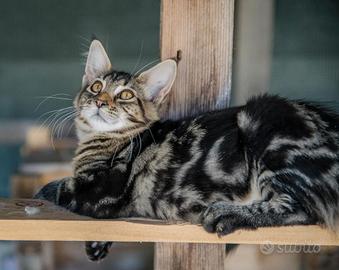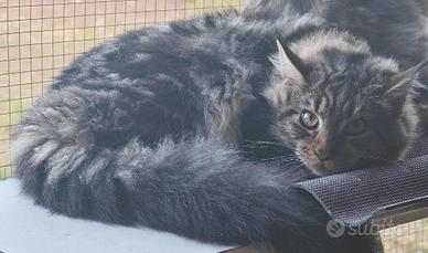 Bellissima gattina Maine Coon taglia gigante di 7 mesi circa, completamente vaccinata e svermata, educata alla lettiera e tiragraffi, pulitissima, con pedigree da compagnia che ne dimostra la purezza, genitori entrambi nostri. Possibilità di consegna in diverse zone.