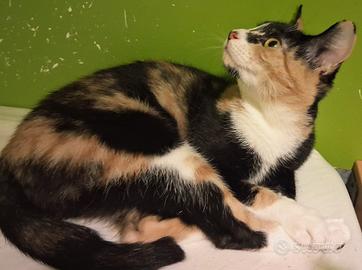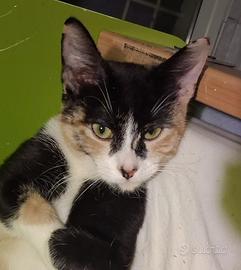 La piccola ha un musetto particolare,con zigomi alti e pronunciati ed è tricolore( bianca,rossa tigrata e nera).
