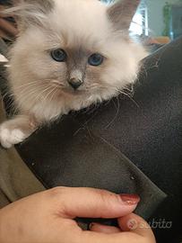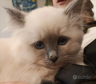 Gattina sacro di Birmania, colorazione Blue point. Tenerissima e dolcissima, vaccinata e sverminata, abituata a lettiera e tiragraffi. Disponibile dal 25 aprile