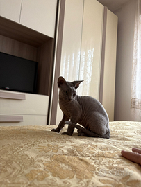 Bellissima gattina sphinx ,coccolona ,nata in casa con bambini,perciò abbituata con la loro presenza.di un colore grigio ghiaccio