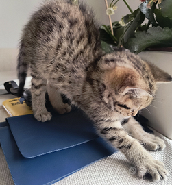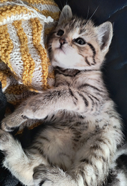 Gattina femmina marroncino chiaro tigrata. Nata il 1 gennaio, sarà disponibile da marzo. Abituata ad altri gatti e alle persone, giocherellona e coccolona. Alimentazione mista. La madre è un incrocio con un Maine Coon, diventerà quindi una gatta grande.
