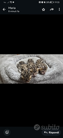 Disponibile già da ora e pronti per una nuova casa, 3 bengalini di 5 mesi, sono 2 maschietti e una femminuccia super coccoloni e che adorano giocare. Hanno una linea di sangue importante e i genitori sono testati sia per le malattie genetiche che infettive, hcm normal.