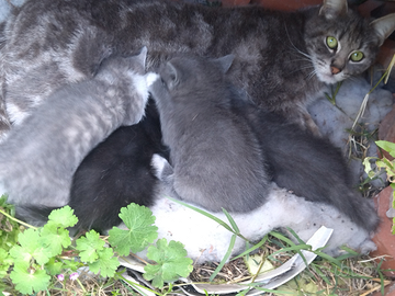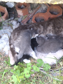 Gattini di all'incirca un mese, colori che variano dal grigio chiaro al nero. Carini, dolci e giocherelloni.