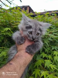 Gattini Maine Coon con pedegree aperto, origine russa e moldava, colore nero silver tichet tabby, sono dispoinibili presso allevamento amatoriale con affisso Anfi. I cuccioli verranno consegnati vaccinati, sverminati e con libretto veterinario. I genitori sono visibili, sono esenti dalle principali malattie genetiche, hanno ecocardio in regola, sono HCM negativi geneticamente e sono testati e vaccinati Fiv e Felv. I cuccioli hanno un ottimo carattere in quanto vivono con noi in famiglia a contatto con cani e altri gatti. Preferibile contatto whats app al 3459218113 o telefono fisso allo 0163851279. Diffidate dai simil Maine Coon perchè potrebbero essere gatti meticci o non essere gatti sani.