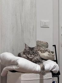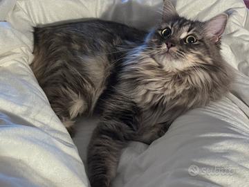 Gattina Maine incrocio coon di circa e ragdoll di tre anni . Non sterilizzata, gattina femmina , molto pigra e nello stesso tempo anche coccolosa. Esame eseguito negativo per Fiv e Felv . Prezzo buono 400 euro in zona milano.