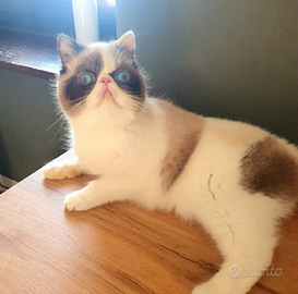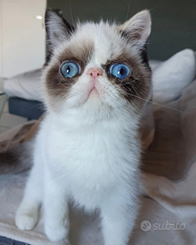 Vi presentiamo Glory Days Loren, gattina exotic shorthair di 14 mesi, seal tortie point con bianco occhi blu cobalto.