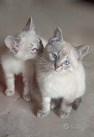 Maschietto e femminuccia simil siamese. Colorazione tabby point. Hanno da poco compiuto 2 mesi. Sono svezzati e sverminati. Usano lettiera e tiragraffi.