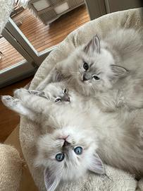 Cuccioli Siberiani Neva Masquerade. Entrambi i genitori sono Siberiani Neva Masquerade con pedigree di alta genealogia. Stanno crescendo in un ambiente domestico e familiare, abituati alle coccole. Hanno un carattere dolcissimo e sono ipoallergenici. Pronti ad entrare in una nuova famiglia dal 24 aprile.