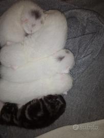 Bellissimi gattini, bianchi di cui uno tigrato scuro, nati il 15 Marzo, vivono in casa, assieme alla sua mamma e papà che sono tutti e due bianchi. Saranno pronti per la fine di maggio... Dopo aver finito le sverminazioni, svezzati,usare la lettiera, e il tiragraffi. Solo a famiglia che ha già esperienza con gatti è animali. Chi fosse interessato, Chiedo 70 Euro l'uno. Grazie.