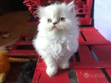 Cucciolo di gatto persiano bianco nato il 9 agosto 2025, normotipo e pelo lungo, ha un occhio azzurro e uno diventerà ambra, quando il cambio del colore sarà definitivo (ora è sul verdognolo). Mamma gatto persiano bianco occhi azzurri, papà persiano exotic. Cresciuto in un ambiente familiare amorevole, libero e a contatto con gli umani e i suoi simili, abituato a lettiera e tiragraffi, NO GABBIE o ISOLAMENTO.