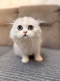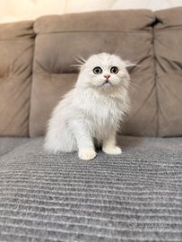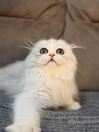 Splendido gattino Scottish Fold maschio a pelo lungo con pedigree Cerco una famiglia amorevole per questo meraviglioso cucciolo maschio di Scottish Fold a pelo lungo di 4 mesi. Il piccolo ha un carattere incredibilmente dolce e affettuoso, ed è già perfettamente socializzato per la vita domestica. **Caratteristiche:** - Razza: Scottish Fold pelo lungo - Sesso: Maschio - Età: 4 mesi - Con pedigree ufficiale - Completamente vaccinato secondo calendario - Microchip già inserito - Perfettamente abituato alla vita in appartamento **Educazione e comportamento:** Il gattino è estremamente dolce e socievole, con un temperamento calmo e affettuoso. È già completamente educato all'uso della lettiera e utilizza correttamente il tiragraffi, dimostrando ottime abitudini domestiche. Il piccolo viene ceduto esclusivamente come animale da compagnia per una famiglia che possa garantirgli tutto l'amore e le cure necessarie. È pronto per iniziare la sua nuova vita in una casa amorevole.