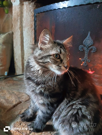 Simil norvegese. Cinque mesi. Socievole e fiducioso, affettuoso e coccolone. Si farà proprio un bel gattone.